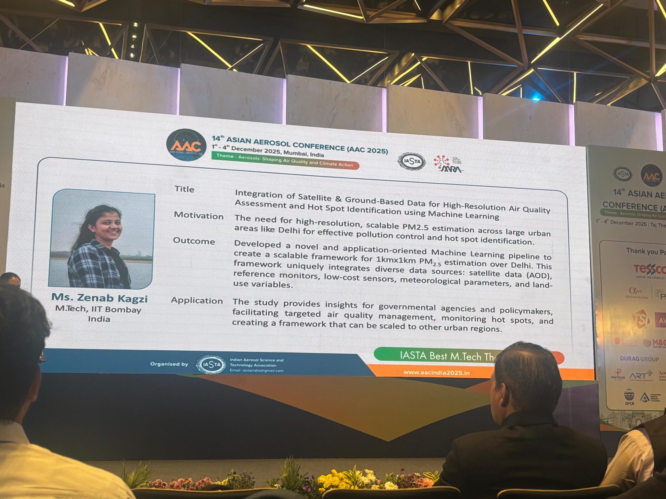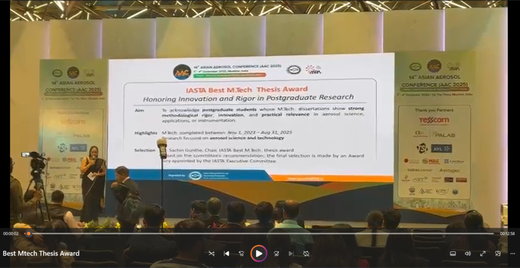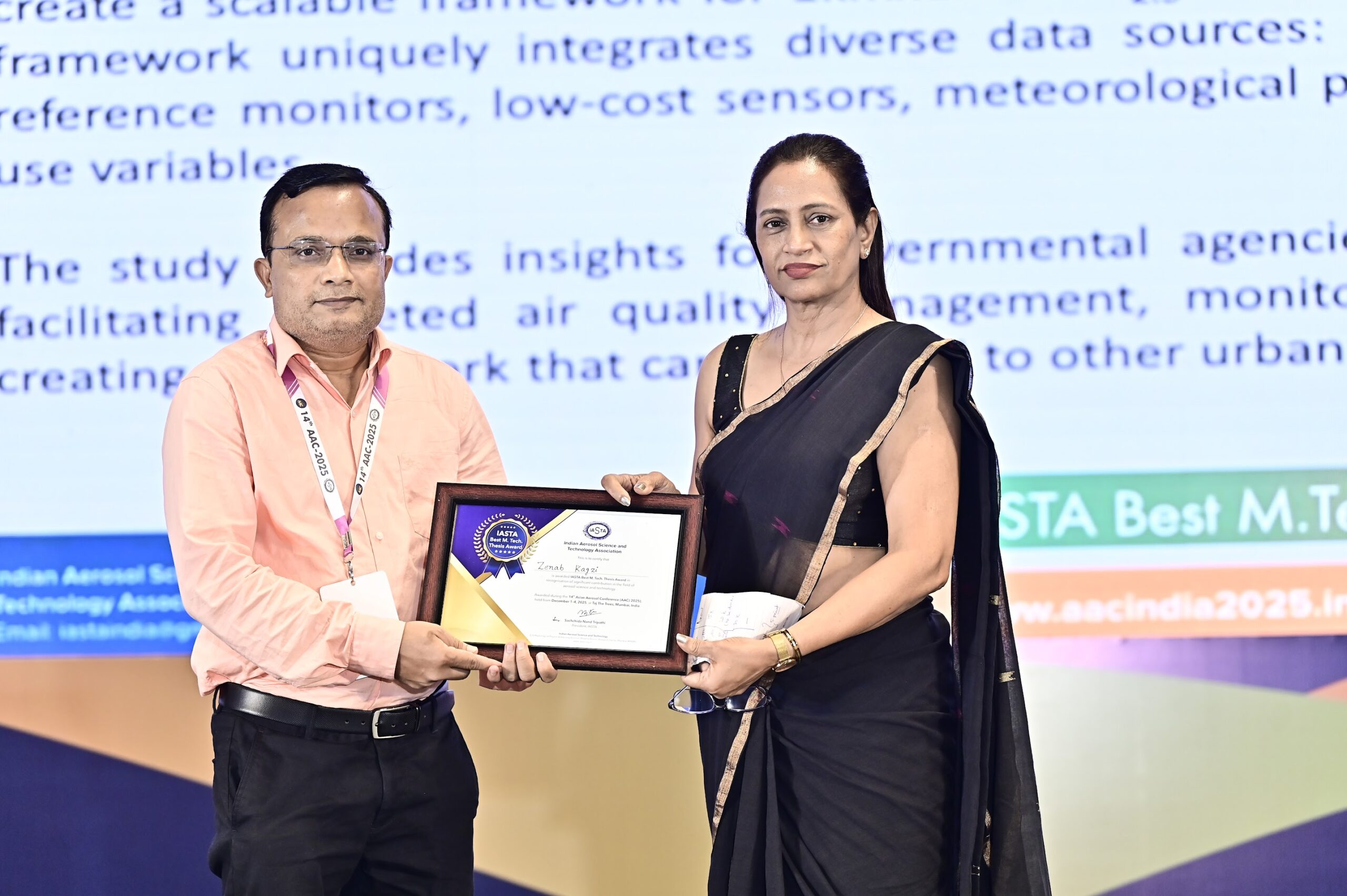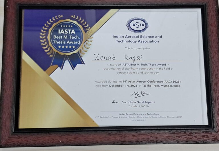 Congratulations to Zenab Kagzi on receiving the IASTA Best M.Tech. Thesis Award for significant contribution in the field of aerosol science and technology, during the 14th Asian Aerosol Conference, 2025.